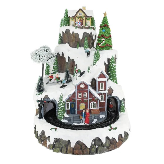 Gare du village de Noël. Petit train faisant le tour du village, patineurs. Deux modes d'alimentation : le premier active la musique, les mouvements et les lumières ; le second active uniquement les lumières et les mouvements, la musique étant désactivée. Transformateur inclus. Polyrésine. H 46,50 cm, L 35 cm, P 36 cm