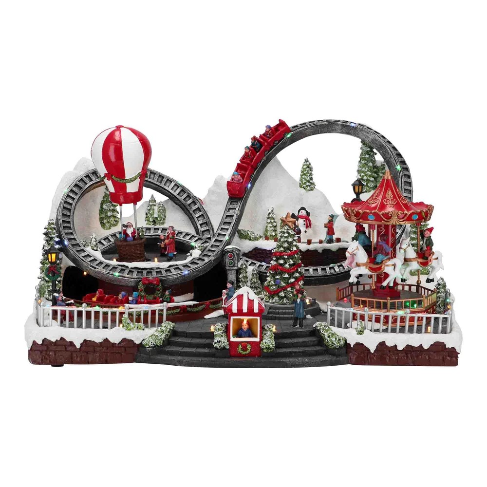Giostra Natalizia Lunapark villaggio innevato luci e movimento con montagne russe giostra e mongolfiera carillon che suona melodie natalizie