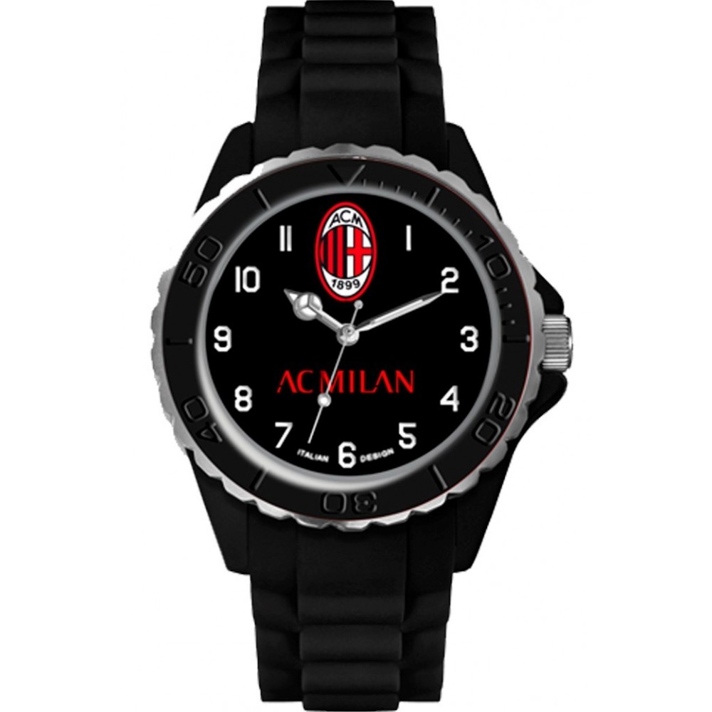 Orologio da Bambino Ufficiale AC Milan con cinturino nero in gomma e ghiera esterna in acciaio. Quadrante nero con scudetto e scritta AC Milan. Vetro minerale piatto e fondello a vite in acciaio.